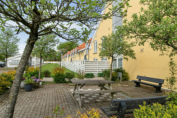 Der er terrasse/have til lejlighederne i stuen og depotrum og parkeringsplads til hver lejlighed.